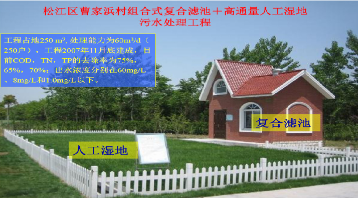 占地小:60m3/d處理量,設備占地面積約28m2,加人工濕地占地面積約250m2,為傳統人工濕地技術的1/3;