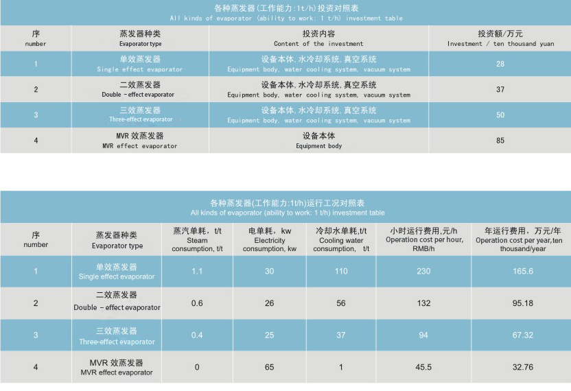 各種蒸發(fā)器的投資和運(yùn)營情況對照/