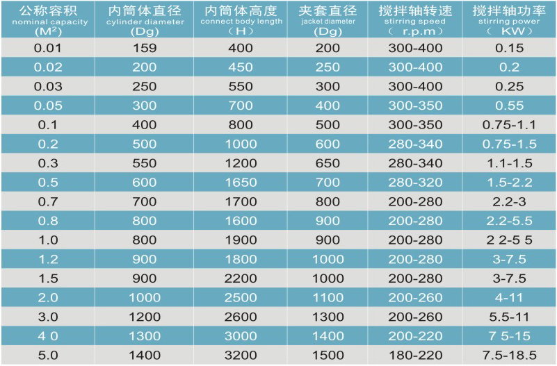 攪拌種子罐主要技術參數參考表/Reference table of main technical parameters of stirring seed tank